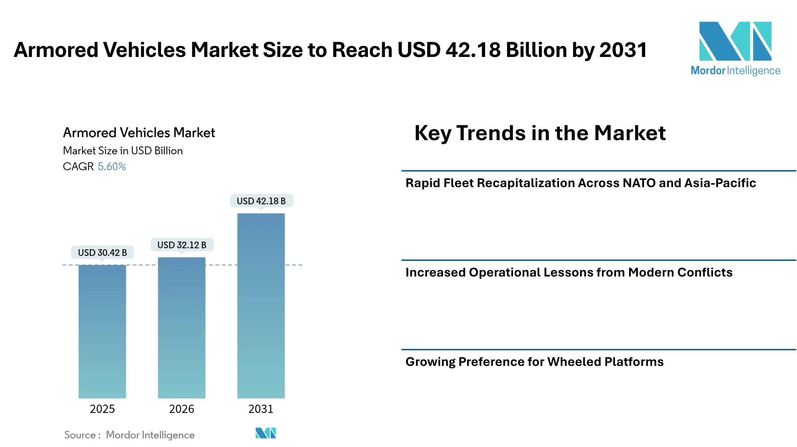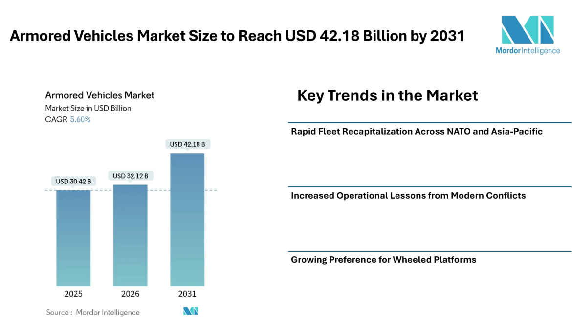 According to Mordor Intelligence, the armored vehicles market size is projected to grow from USD 30.42 billion in 2025 to USD 32.12 billion in 2026 and is expected to reach USD 42.18 billion by 2031, registering a CAGR of 5.6% during the forecast period. The armored vehicles industry is witnessing steady expansion as governments accelerate fleet replacement programs and strengthen land-force capabilities.