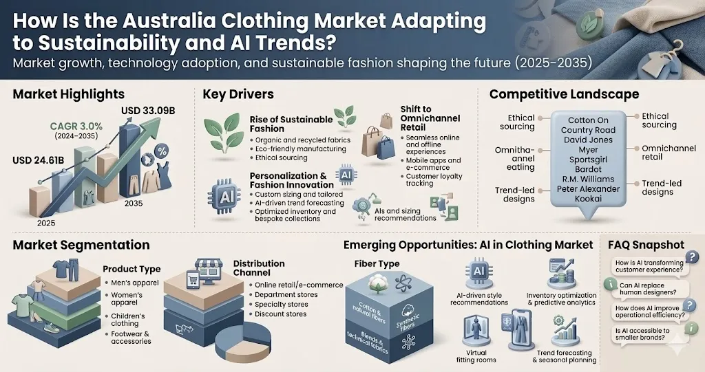According to market forecasts covering 2025 – 2035, revenue in the market is expected to increase from USD 24.61 billion to USD 33.09 billion, reflecting a moderate yet consistent CAGR of 3.0%. This growth is driven by both domestic retail expansion and cross-border fashion consumption, with Australian brands increasingly gaining recognition in international markets.