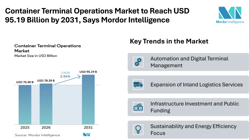 According to Mordor Intelligence, the global container terminal operations market size was valued at USD 75.40 billion in 2025 and is estimated at USD 78.39 billion in 2026, with projections indicating it will reach USD 95.19 billion by 2031 at a CAGR of 3.96%. This steady container terminal operations market growth reflects the essential role ports play in international trade and supply chains. Rising cargo volumes, the expansion of maritime routes, and the arrival of ultra-large container vessels above 18,000 TEU are reshaping how terminals operate worldwide.
