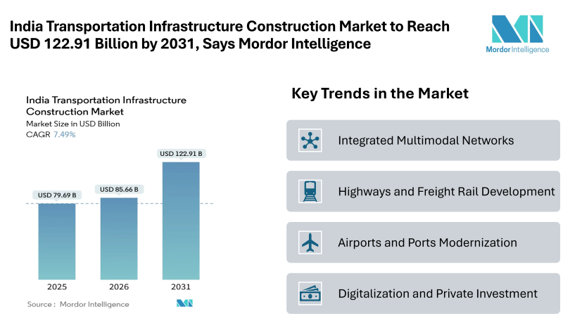 According to Mordor Intelligence, the India transportation infrastructure construction market size was valued at USD 79.69 billion in 2025 and is estimated to grow to USD 85.66 billion in 2026, reaching USD 122.91 billion by 2031, at a CAGR of 7.49% during the forecast period (2026–2031). This steady expansion reflects sustained public investment, policy continuity, and rising demand for efficient mobility across road, rail, air, and maritime networks. The India transportation infrastructure construction industry is witnessing strong project pipelines supported by government programs aimed at improving logistics efficiency, reducing travel time, and supporting economic activity across regions.