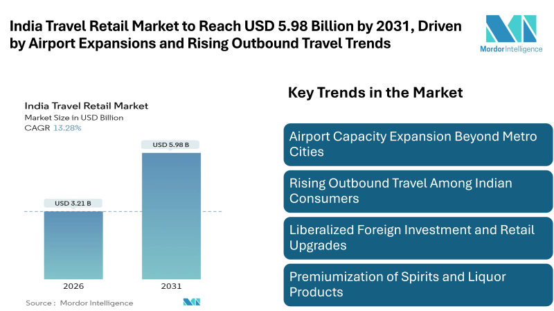 According to Mordor Intelligence, the India travel retail market was valued at USD 2.83 billion in 2025 and estimated to grow from USD 3.21 billion in 2026 to reach USD 5.98 billion by 2031, at a CAGR of 13.28%. Several factors are contributing to this expansion, including upgrades to airport infrastructure, increasing disposable income among the middle class, liberalized foreign investment regulations, and rising outbound travel by Indian consumers.
