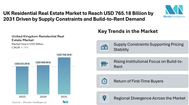 According to Mordor Intelligence, the UK residential real estate market size is valued at USD 598.45 billion in 2026 and is expected to reach USD 765.18 billion by 2031, growing at a CAGR of 4.79%. The market growth reflects a steady recovery supported by strong demand fundamentals, limited housing supply, and continued interest from institutional investors. Despite affordability concerns in certain regions, the overall market forecast remains stable.